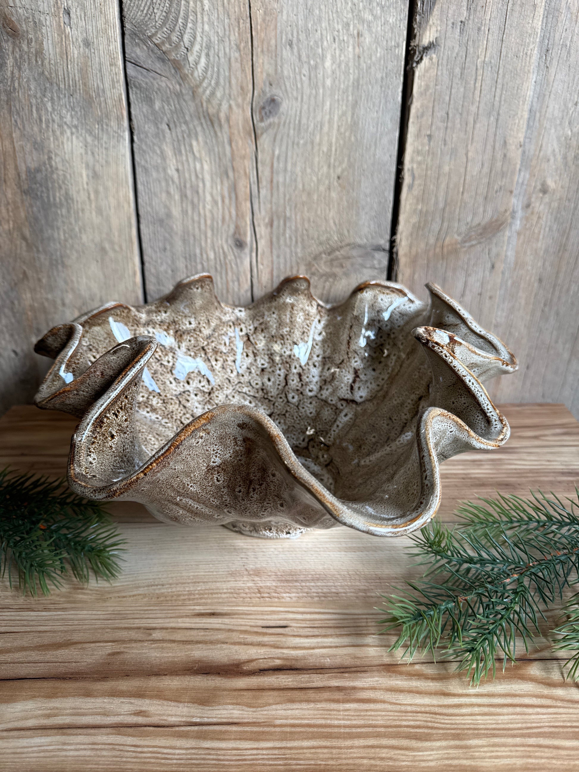 Mit ihrer außergewöhnlichen, organischen Form und der handwerklich anmutenden Glasur in Brown Mélange zieht sie alle Blicke auf sich. Die hochwertige Keramik und die lebendige Oberfläche verleihen der Schale eine warme, natürliche Ausstrahlung – perfekt als Dekoobjekt oder zum stilvollen Anrichten von Obst, Trockenblumen oder Kerzenarrangements.