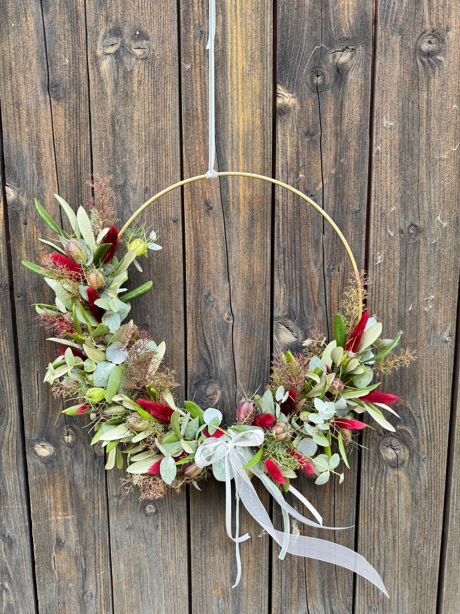 Unser liebevoll handgebundener Loop in Grün-Bordeaux-Tönen (Ø 30 cm) bringt natürliche Eleganz in dein Zuhause. Gefertigt aus frischen Materialien, die beim Trocknen ihre Schönheit behalten, ist dieser Loop ein stilvoller Blickfang für deine Wohnungstür oder den Innenbereich.