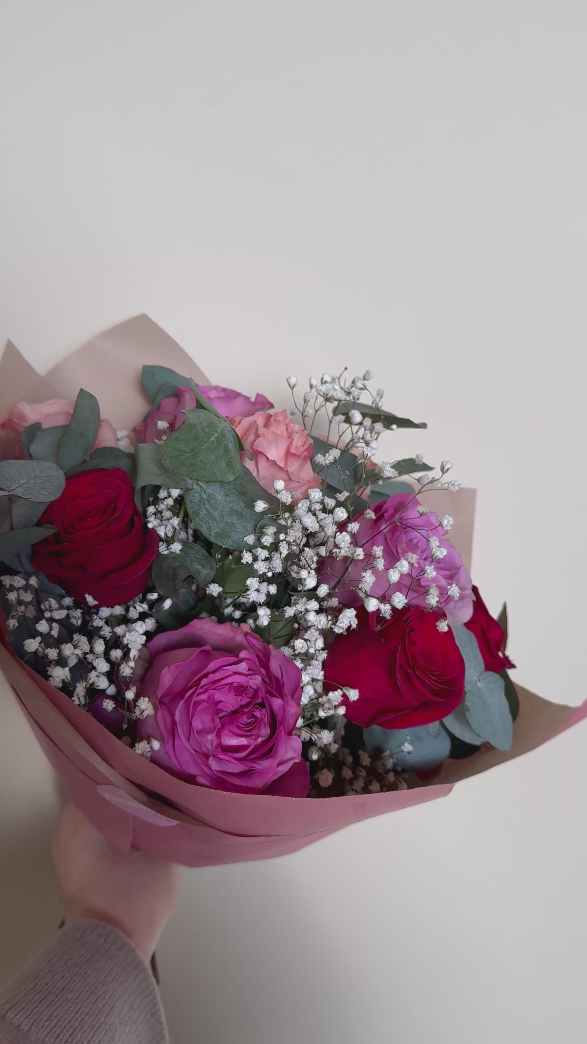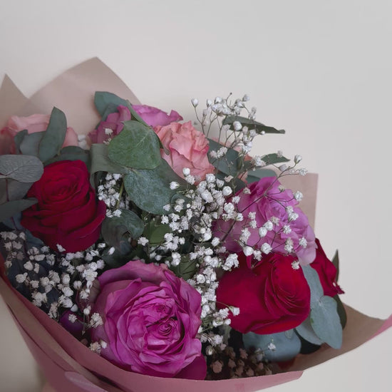 Neun großköpfige Rosen in Rot-, Rosé- und Pinknuancen treffen auf zartes Schleierkraut und frischen Eukalyptus.