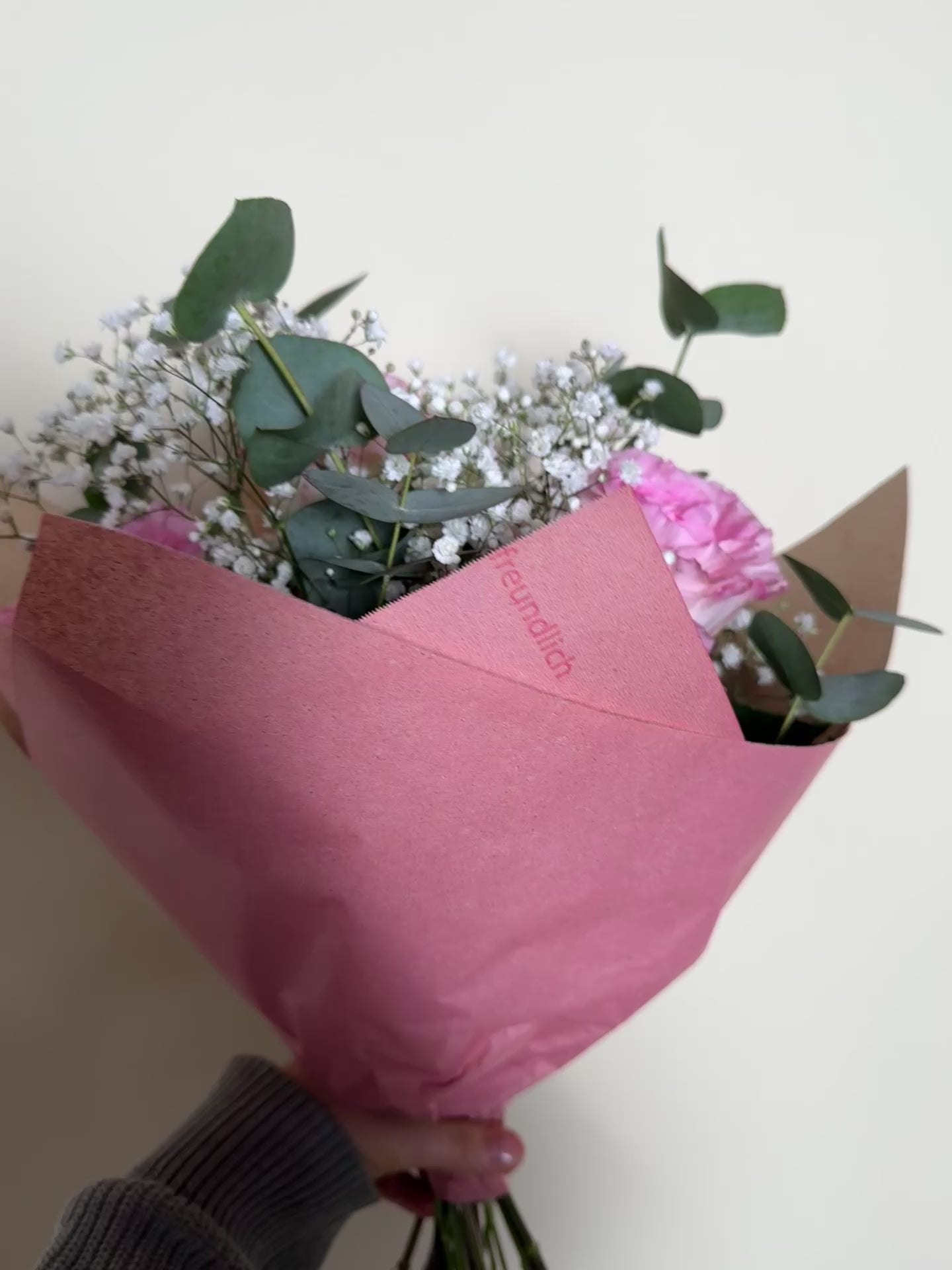 Großköpfige Ecuadorrosen in sanftem Rosa treffen auf feines weißes Schleierkraut und dekorativen Eukalyptus. Die harmonische Farbkomposition in Rosa-Weiß wirkt modern, edel und passt zu jedem Anlass — ob Geburtstag, Valentinstag oder als liebevolle Aufmerksamkeit.