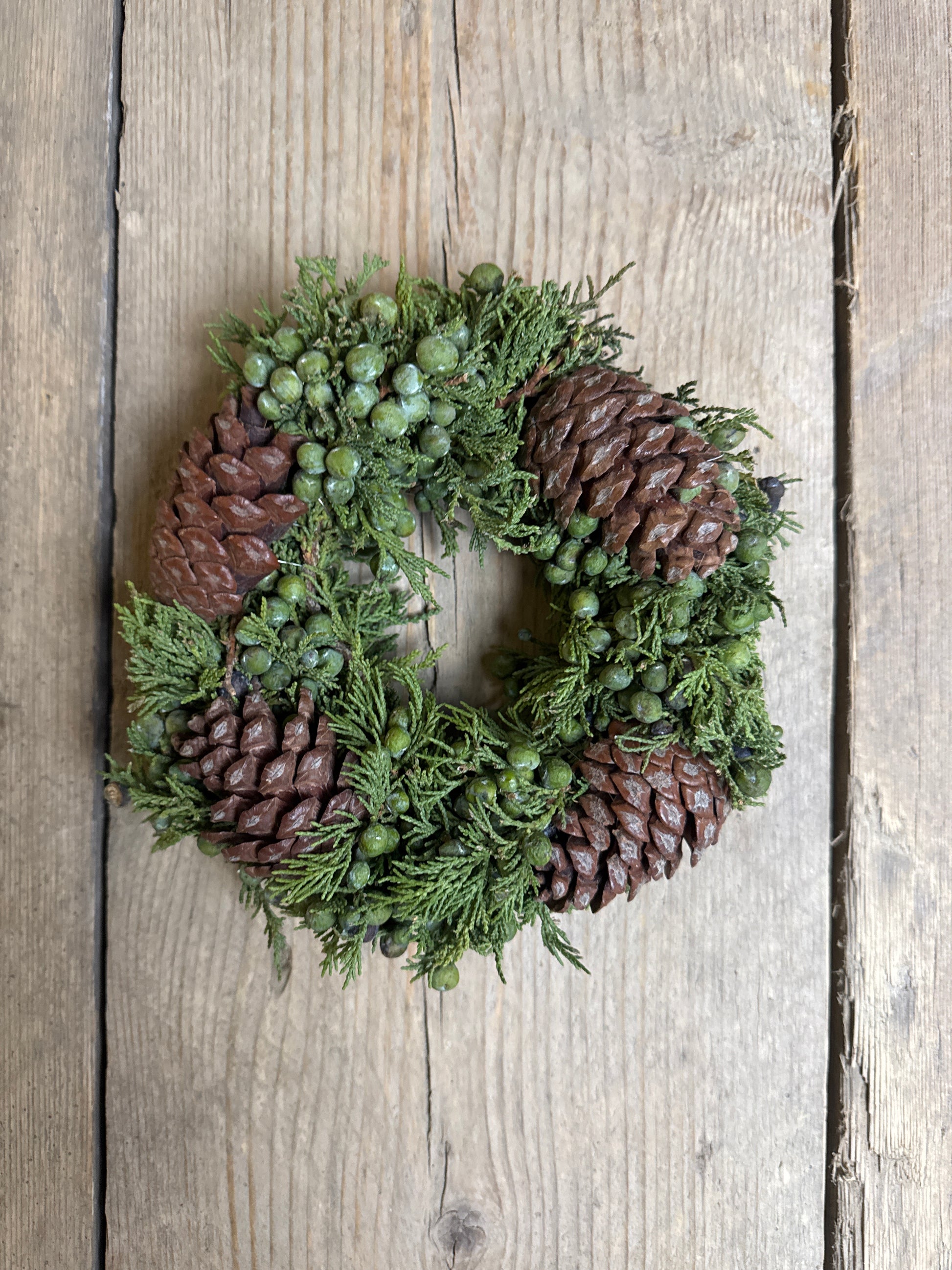 Ein liebevoll gebundener Kranz aus frischer Thuja-Zypresse, verziert mit naturbelassenen Zapfen. 🌿